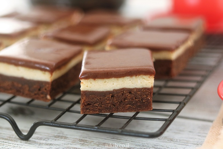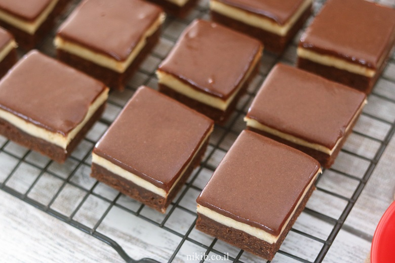 לקרר את החיתוכיות מספר שעות (כדי שהקרם יתייצב). מומלץ בחום להקפיא אותן שעה לפני החיתוך – זה מבטיח קוביות יפהפיות!