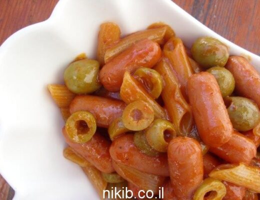 נקניקיות מוקפצות עם זיתים ואטריות אורז